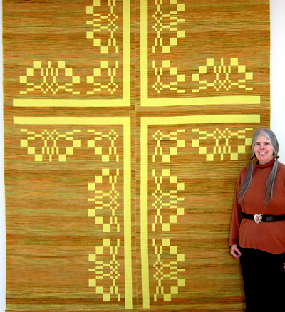 Pat Hilts standing beside her large tapestry weaving of a floral edged cross in gold