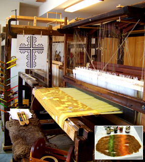 Stages in the weaving process include hand-dying the yarn (inset), designing the pattern (hanging beside the loom), stringing the warp (length-wise fibers) onto the loom, and finally, many hours of actual weaving. (photos by Pat Hilts)